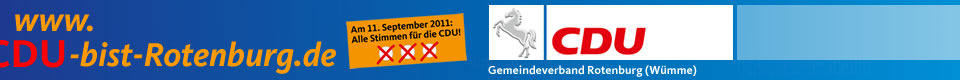 Lieber Besucher der Seite "Du-bist-Rotenburg.de", unter dem Motto "Du-bist-Rotenburg" möchten wir Sie über die Arbeit des CDU Gemeindeverbandes Rotenburg (Wümme) informieren. In Kürze finden Sie hier unser Wahlprogramm zur Kommunalwahl 2011 und Informationen über den CDU-Gemeindeverband und die Arbeit des der CDU-Stadtratsfraktion. Wenn Sie sich über unsere Arbeit sofort informieren möchten, finden Sie Informationen unter Schauen Sie bald wieder